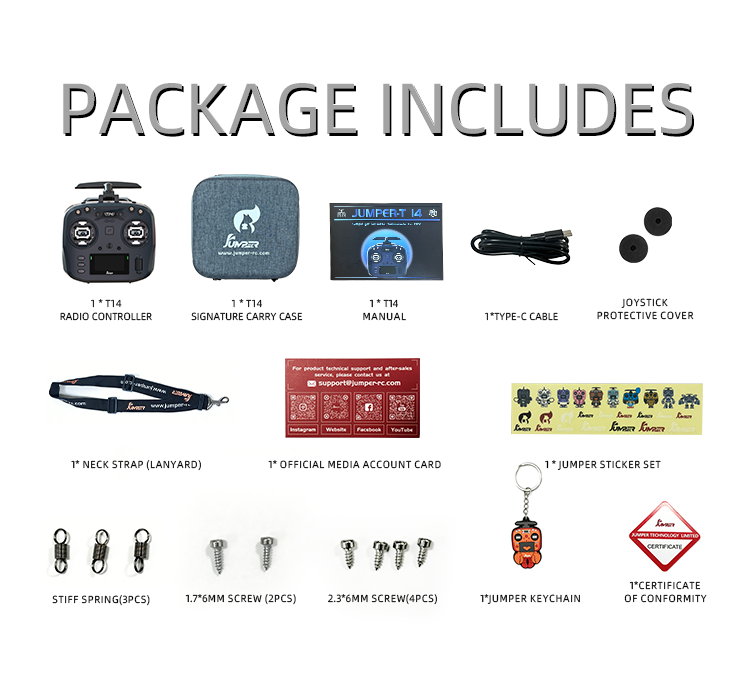 The Jumper T14 is a compact, high-performance open-source RC radio transmitter built for FPV drone pilots and RC enthusiasts, running the official EdgeTX firmware. Designed to balance lightweight portability, reliable long-range performance, and customizable functionality, it is the perfect choice for hobbyists seeking a powerful yet affordable transmitter for freestyle, racing, and fixed-wing flights.