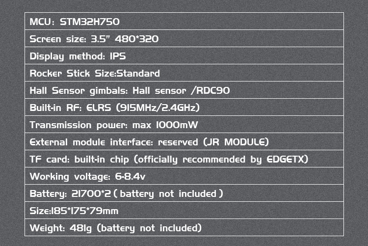 • TF card: built-in chip (officially recommended by EDGETX)
